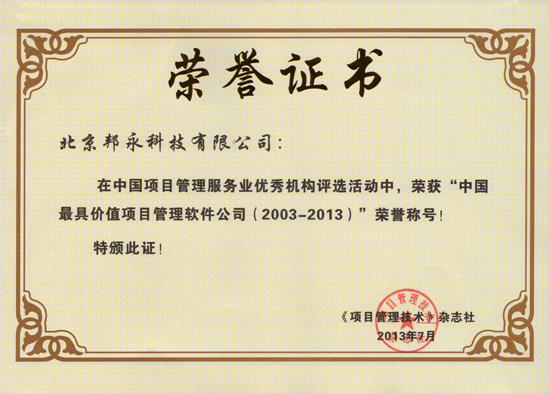 慶祝邦永榮獲“中國最具價(jià)值項(xiàng)目管理軟件(2003-2013)”企業(yè)獎(jiǎng)
